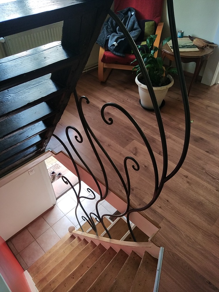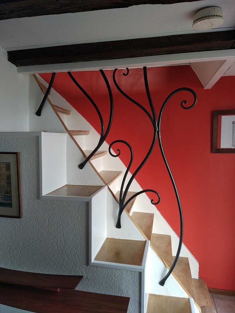Claustra en fer rond de différents diamètres (20, 18, 16) entre deux petits escalier. Brut ciré
