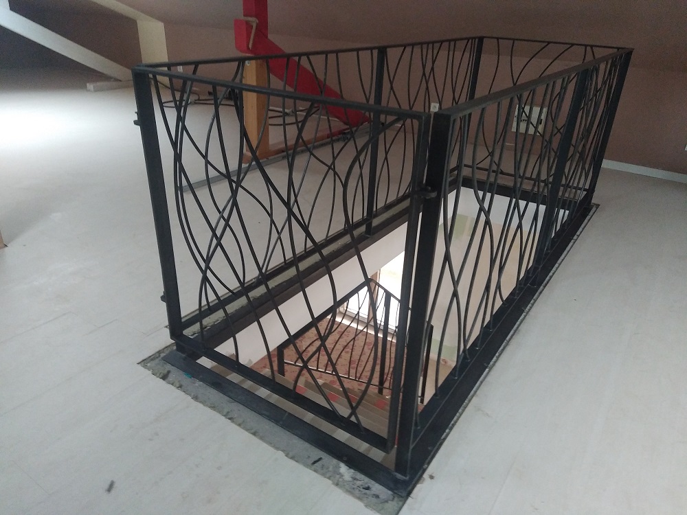 Escalier à limon centrale en poutrelle H de 160mm. Rampes et garde-corps de trémie (avec cornière d’habillage de l’angle) en 40/10 et rond de 10 formé. Brut ciré.