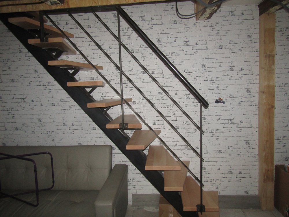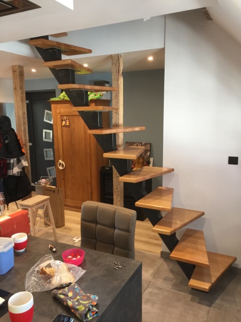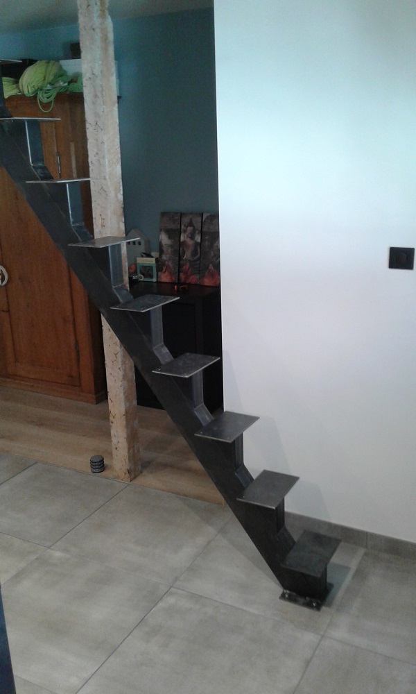 Les escaliers sont formé d’un tube métallique rectangulaire et de fers plats larges soudés dessus qui reçoivent les marches bois.