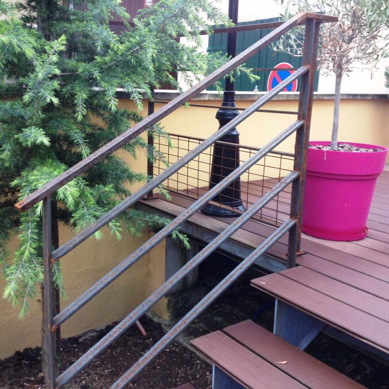 Réalisation d’un garde-corps de terrasse avec rampe d’escalier. Les éléments ont été pré-fabriqués en atelier puis assemblés par soudure tig sur place. Laissés brut pour une rouille naturelle.