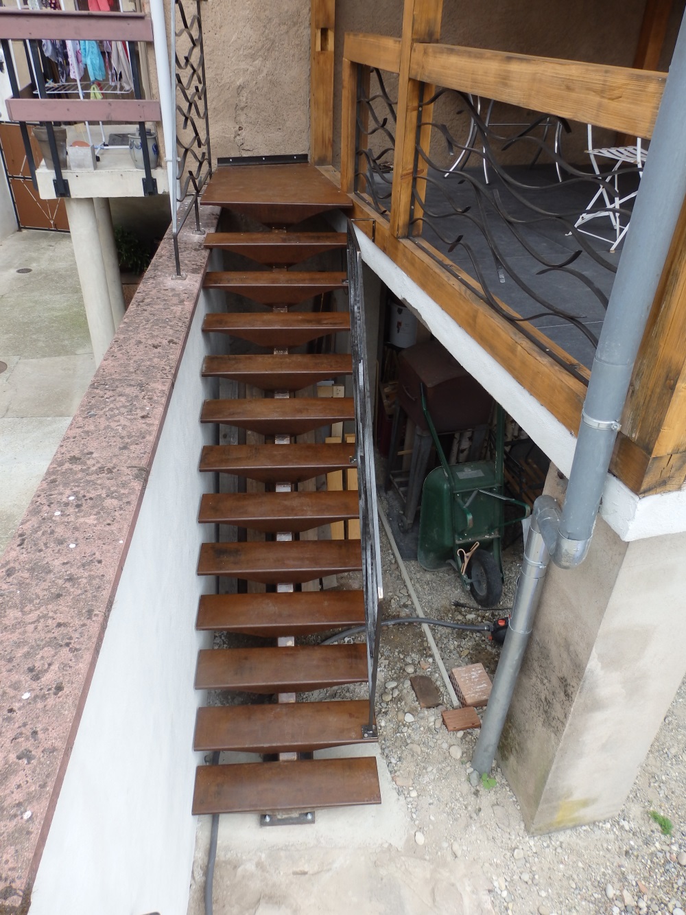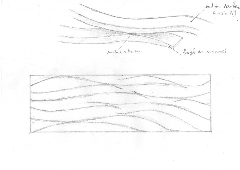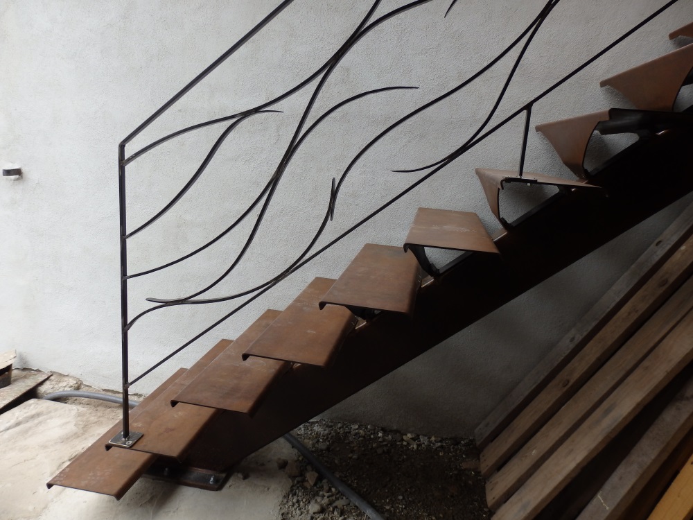 Les rampes  et les garde-corps (8m linéaires) sont en fer plat de 20×8 forgé. La finition est brut huilé.