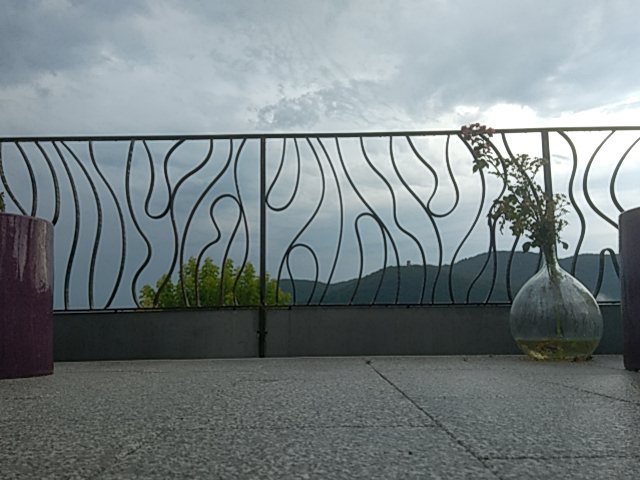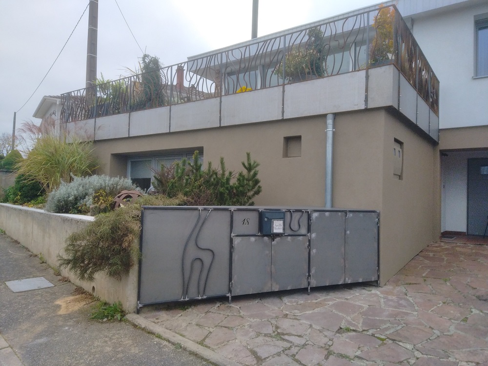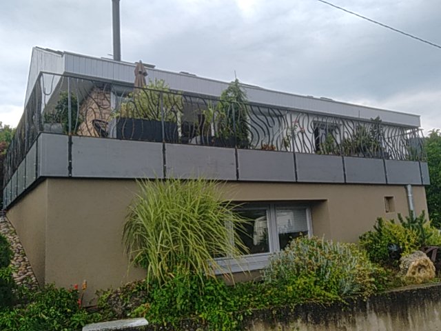 Garde-corps de terrasse avec motif en fer plat 25×8 et soubassement en tôle.