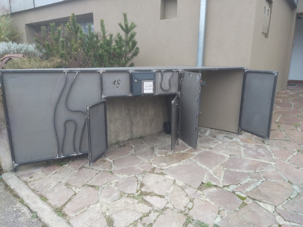 Habillage de coin en local de rangement, structure en tube 25×25 et tôle de 2mm. L’ensemble est brut.