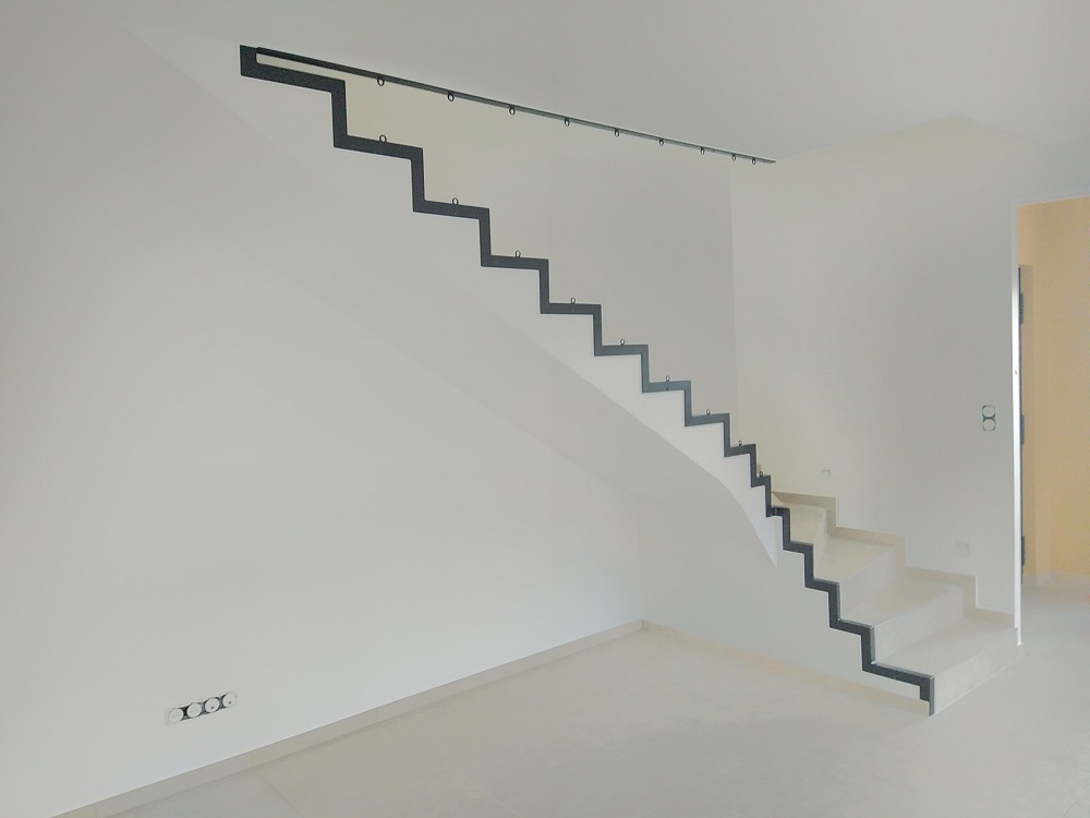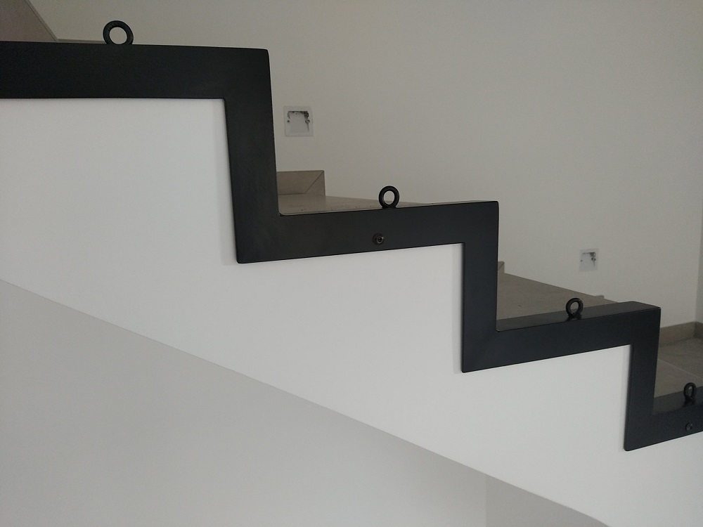 Habillage d’un escalier beton en « crémaillère ». Avec anneaux soudés pour support de corde. Les client ont fourni et tressé la corde. Peint en noir.