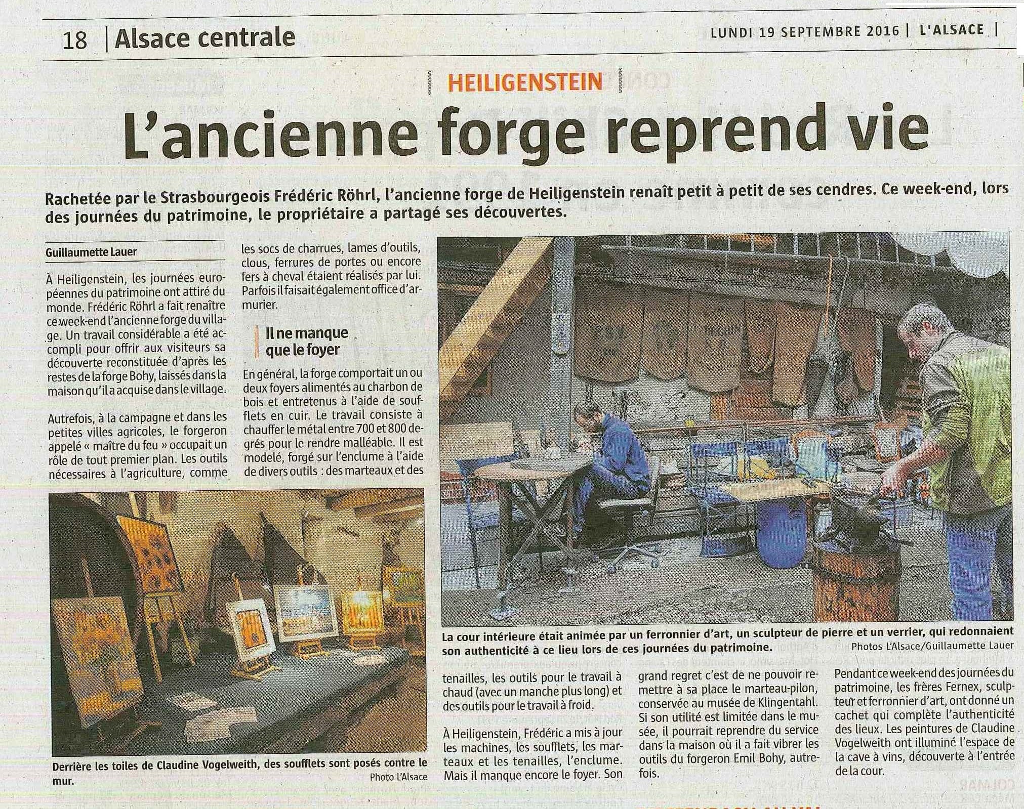 Cette année l’ancienne forge du village de Heiligenstein ouvrira ses portes a l’occasion des journées du patrimoine les 17 et18 septembre. Je serai présent sur place pour une démo de forge parmi d’autres artisans (voir affiche dans le lien ci-joint).