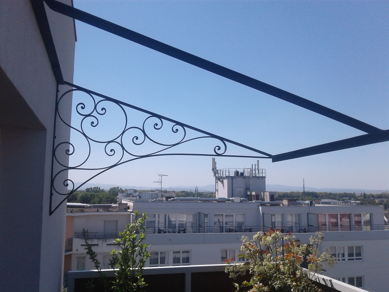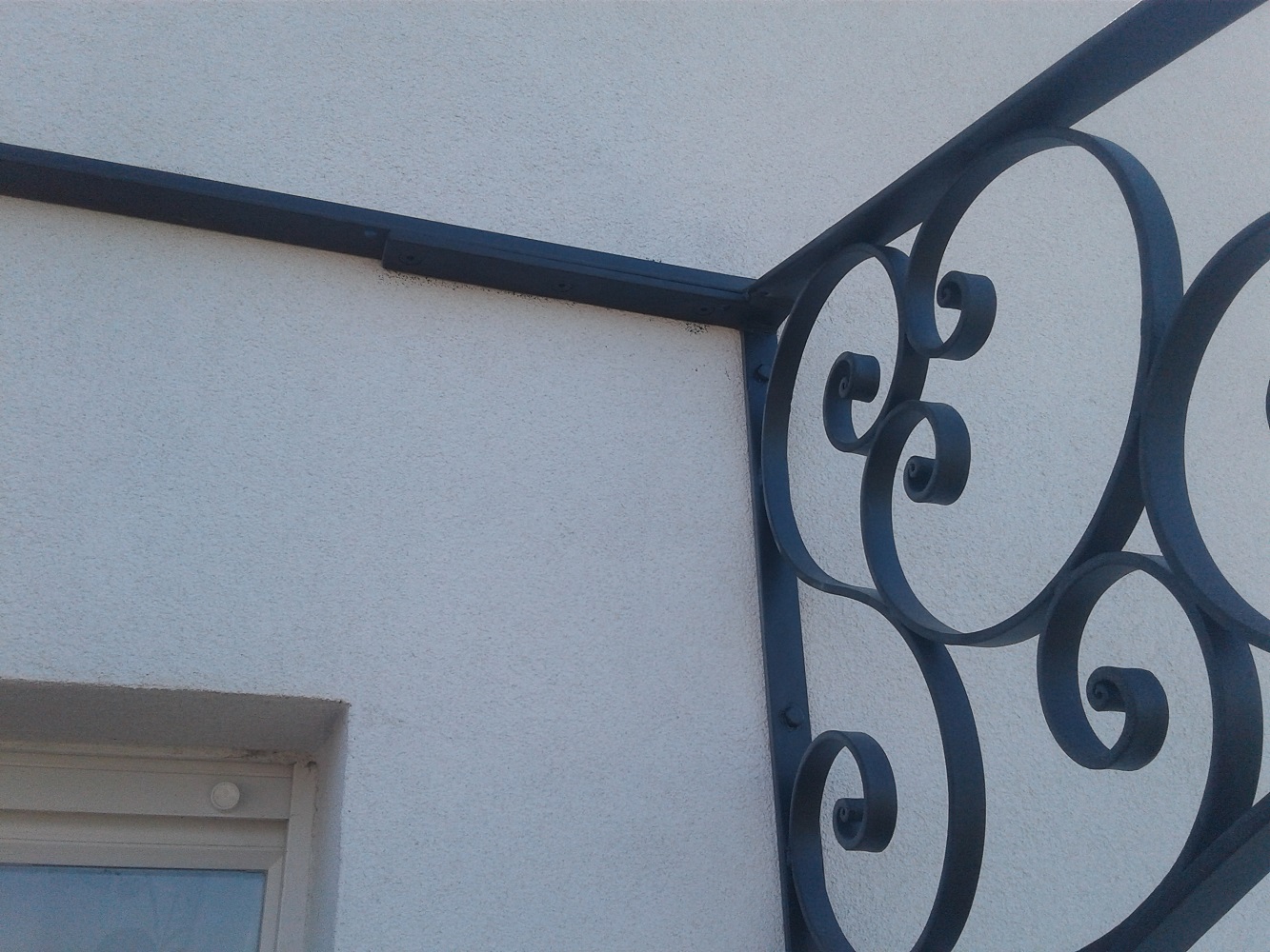 Création d’une marquise en guise d’auvent (pas de vitrage, les clients mettront un store). 3m de long,1.4 de large. La ferronnerie est en plat de 20/6.