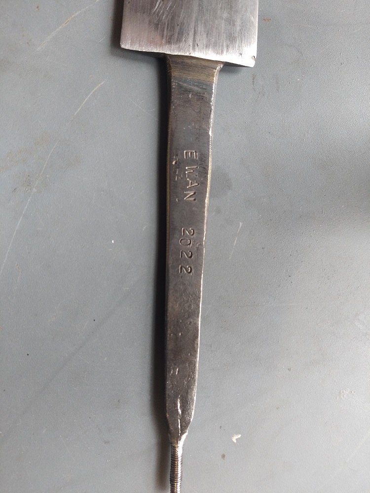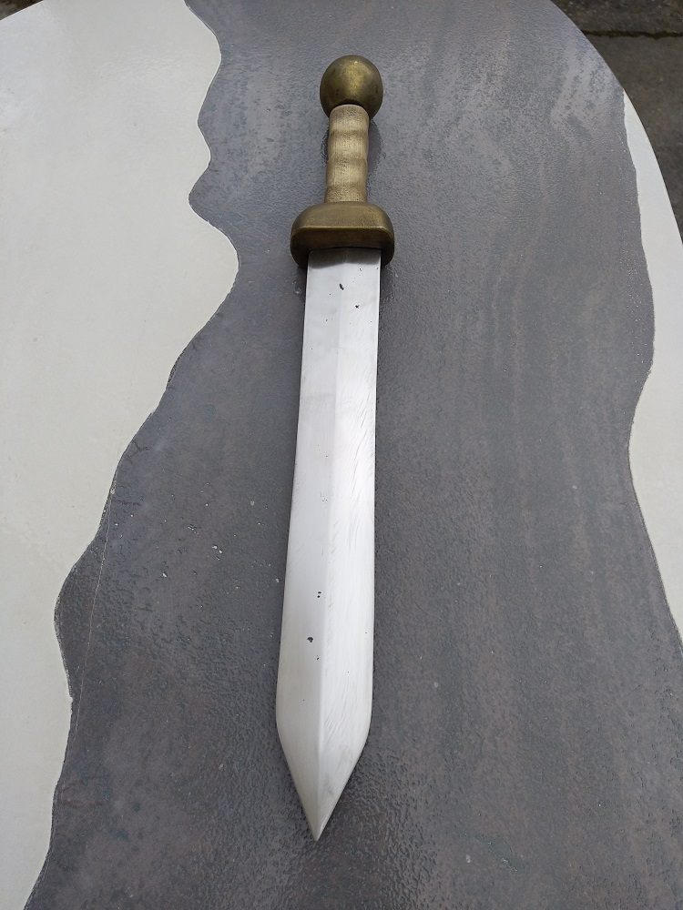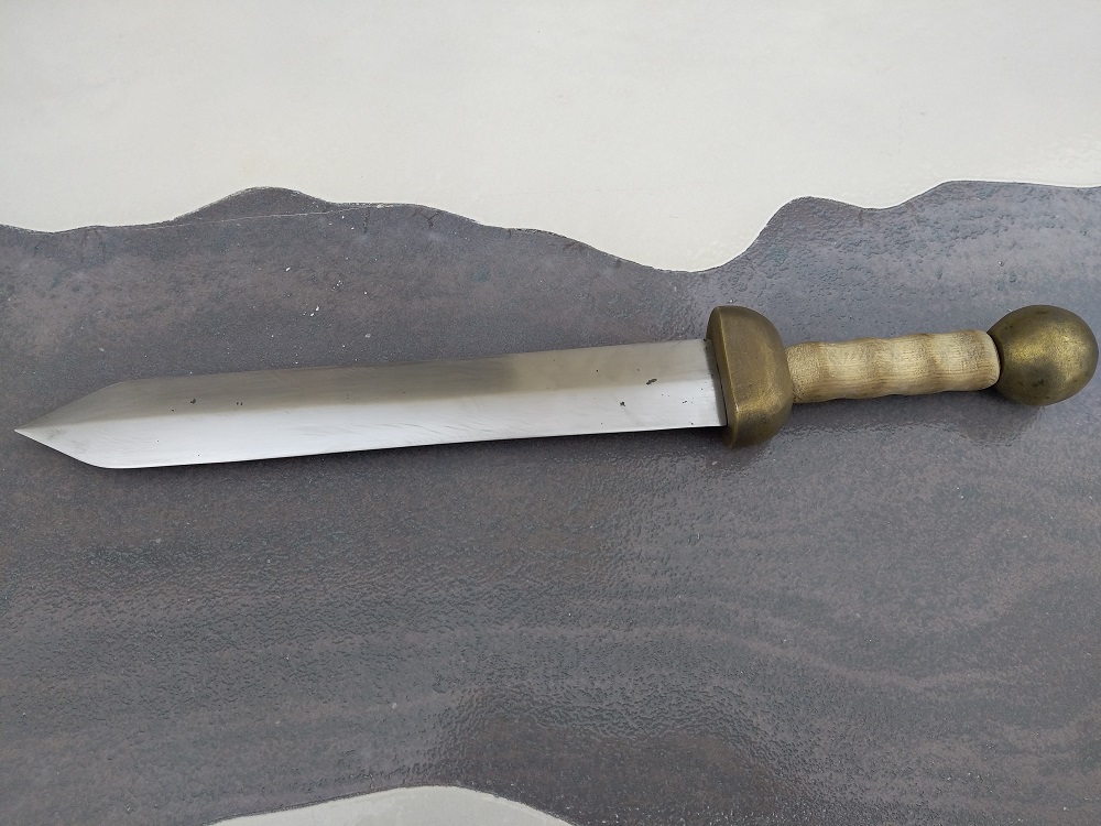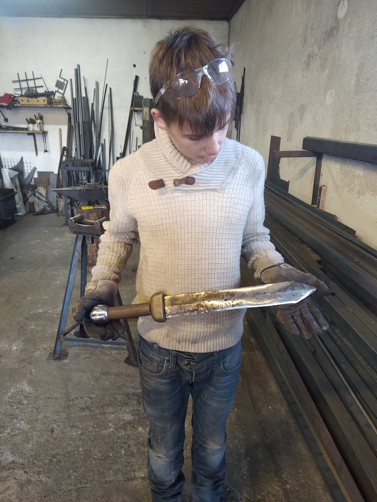 Au printemps 2022, un élève de la 9e (14/15 ans) de l’Ecole Mickaël de Strasbourg (pédagogie Steiner) m’a contacté pour réaliser son « projet d’année », demandé par l’école et en thème libre. Il a choisi de faire un glaive Romain, et après avoir passé 3 jours au sein de mon atelier et sous ma guidance, il a réaliser son projet, dont voici le résultat. Pour plus de simplicité, la lame est en acier doux et donc non trempé.