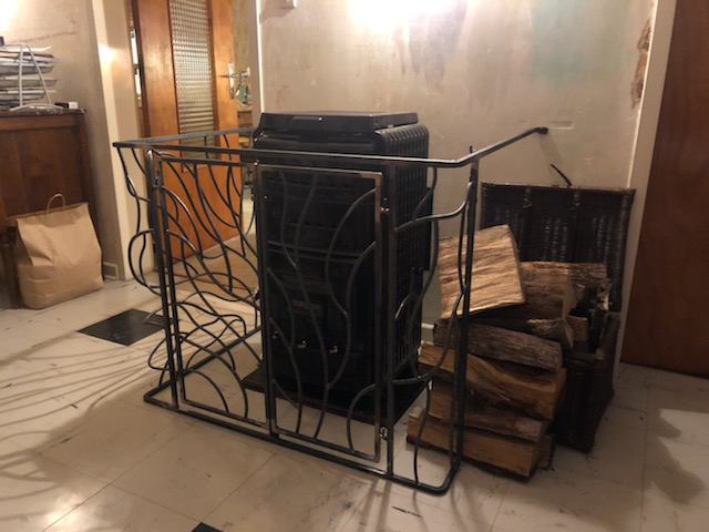 Structure avec deux portes ouvrantes sur le devant pour accès au poêle