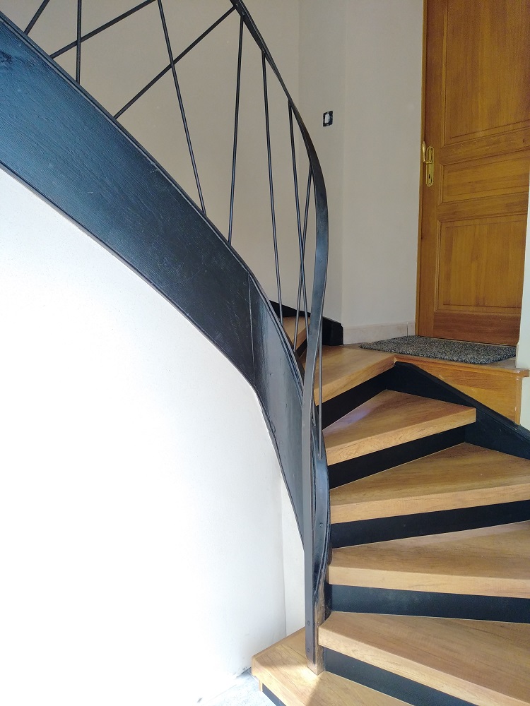 Rampe réalisé sur un escalier en bois d’une ancienne gare. Quatre volées et une partie droite en haut. 15 mètre linéaire en tout. 40/10 et rond de 10. Brut ciré