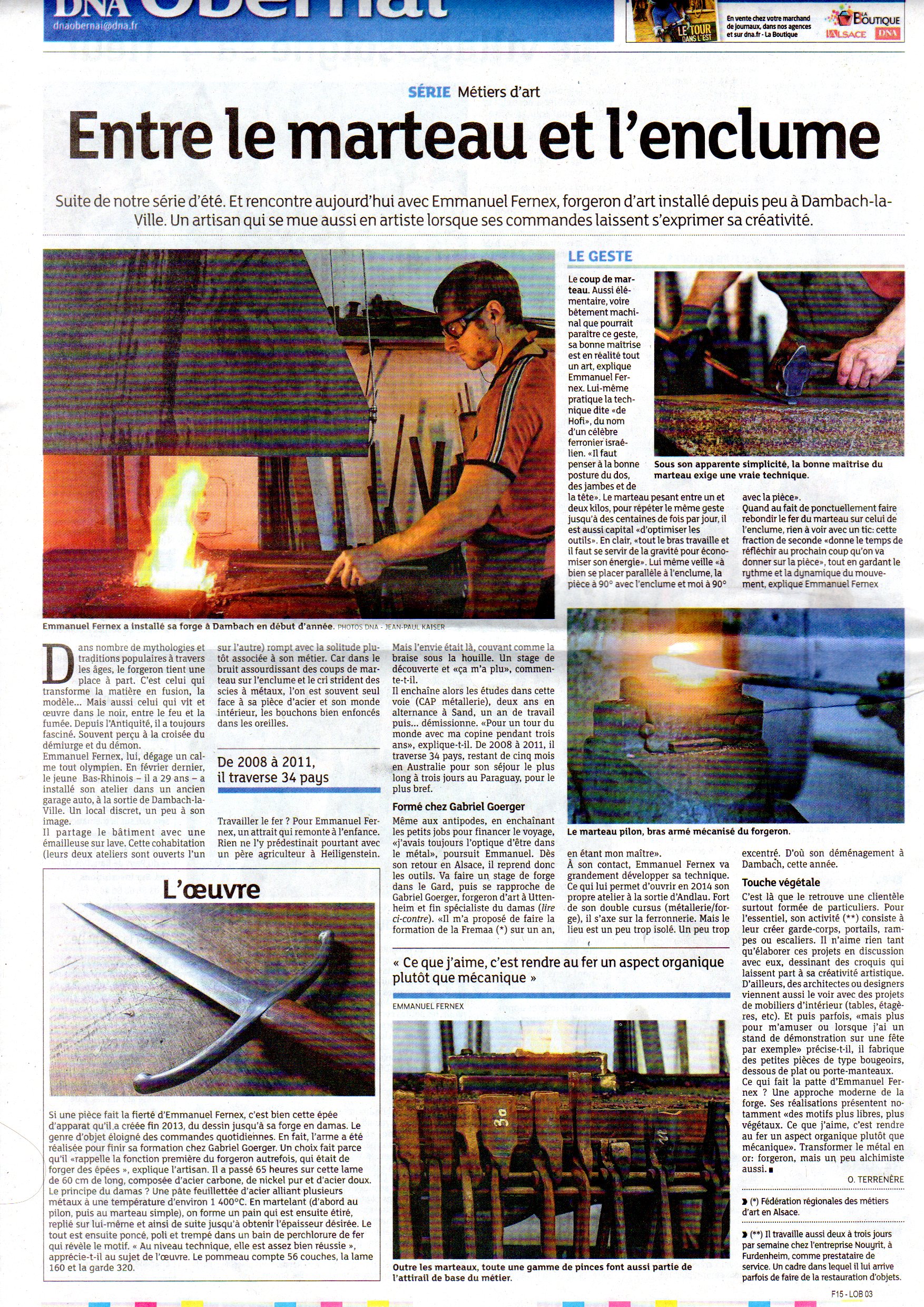 J’ai été contacté en Juin 2017 par les DNA (Dernières Nouvelles d’Alsace, secteur Obernai) pour un article pour leur série d’été sur les métiers d’arts.